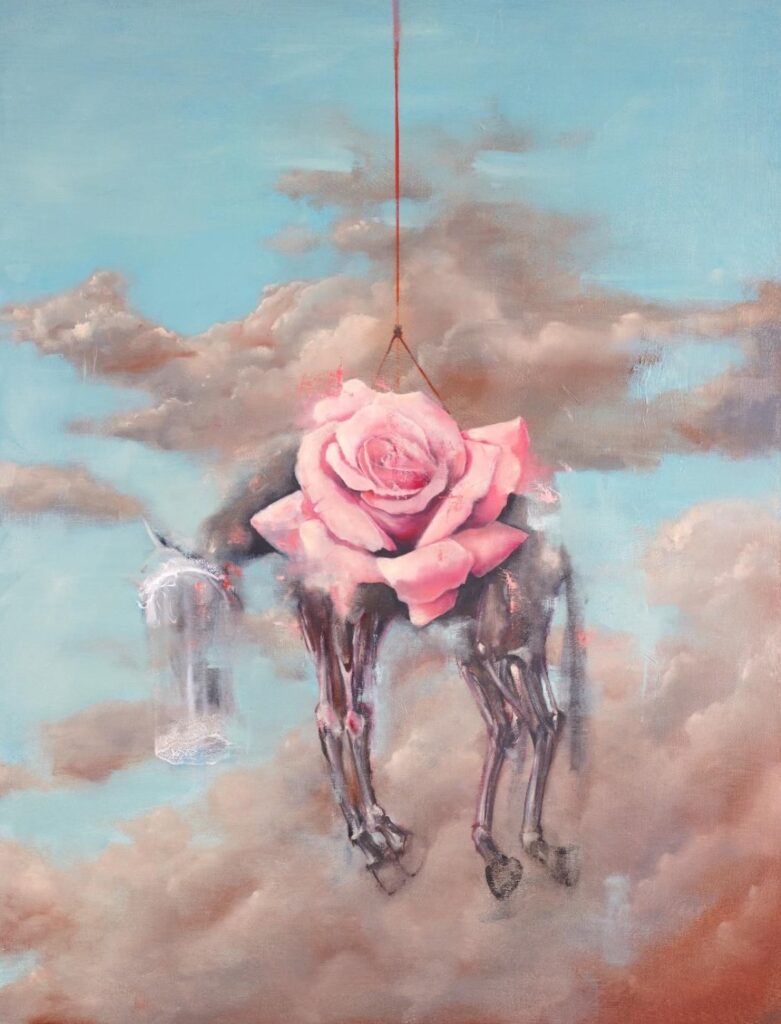 discipline feeding into his distinctive visual language. His paintings, rendered in oil, are visceral explorations of the human